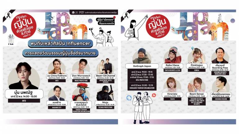 • วันอาทิตย์ที่ 23 พฤศจิกายน 2568 วันสุดท้ายของการจัดงาน พบกับเหล่า YouTuber และ Blogger สายเจแปนที่จะมาเล่าประสบการณ์เที่ยวญี่ปุ่นแบบ Unseen ที่จะทำให้คุณอยากแพ็กกระเป๋าทันที อาทิ แอดอ้น แอดมินเพจ Go!Graph Japan, นัท Eat Chill Wander, ฮารุปี้ Harupiii, เคนจิ หรือมะม่วง ญี่ปุ่นมั้ย? by Kenji และแขกรับเชิญพิเศษ หมอช้าง ทศพร ศรีตุลา พร้อมรับชมโชว์ “นินจา” สุดว้าวที่ส่งตรงจากประเทศญี่ปุ่น