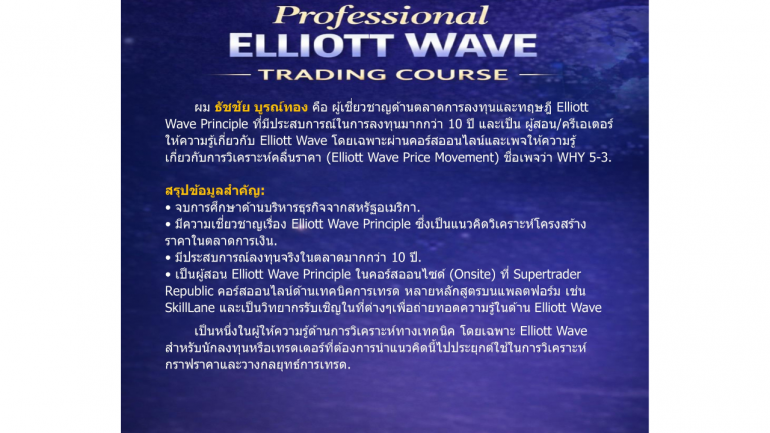 คอร์สนี้สอนโดย ธัชชัย บูรณ์ทอง ผู้เชี่ยวชาญด้าน Elliott Wave Principle ที่มีประสบการณ์ในตลาดการลงทุนมากกว่า 10 ปี เป็นทั้งนักเทรด ผู้สอน และครีเอเตอร์ด้านความรู้ Elliott Wave โดยเฉพาะแนวคิด “WHY 5-3” ซึ่งช่วยให้ผู้เรียนเข้าใจ เหตุผลของโครงสร้างคลื่น ไม่ใช่แค่การนับคลื่นตามตำรา